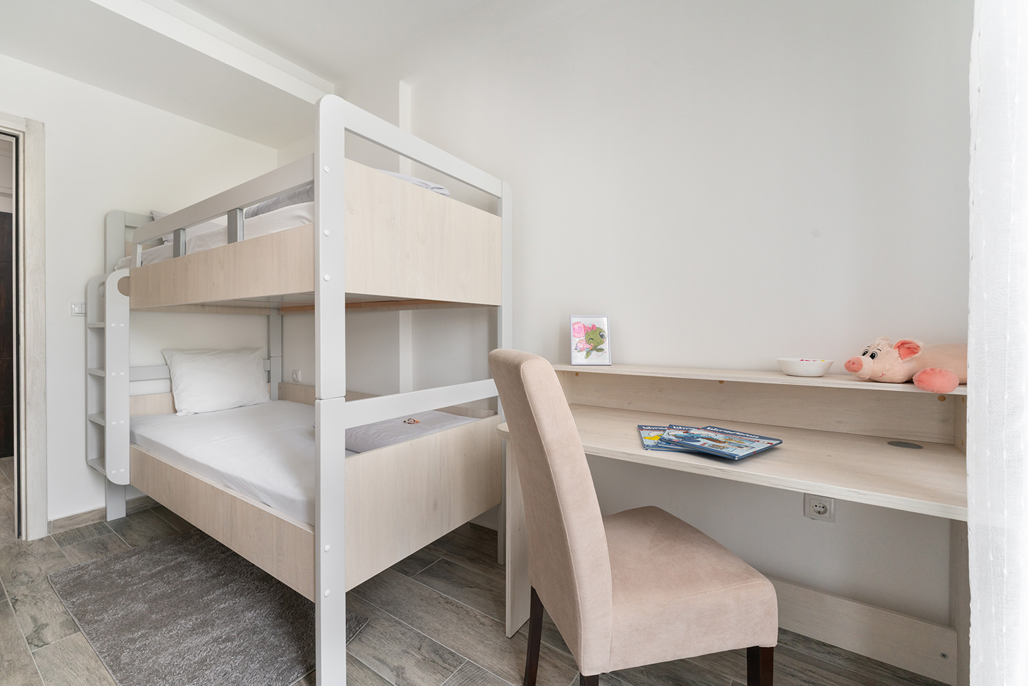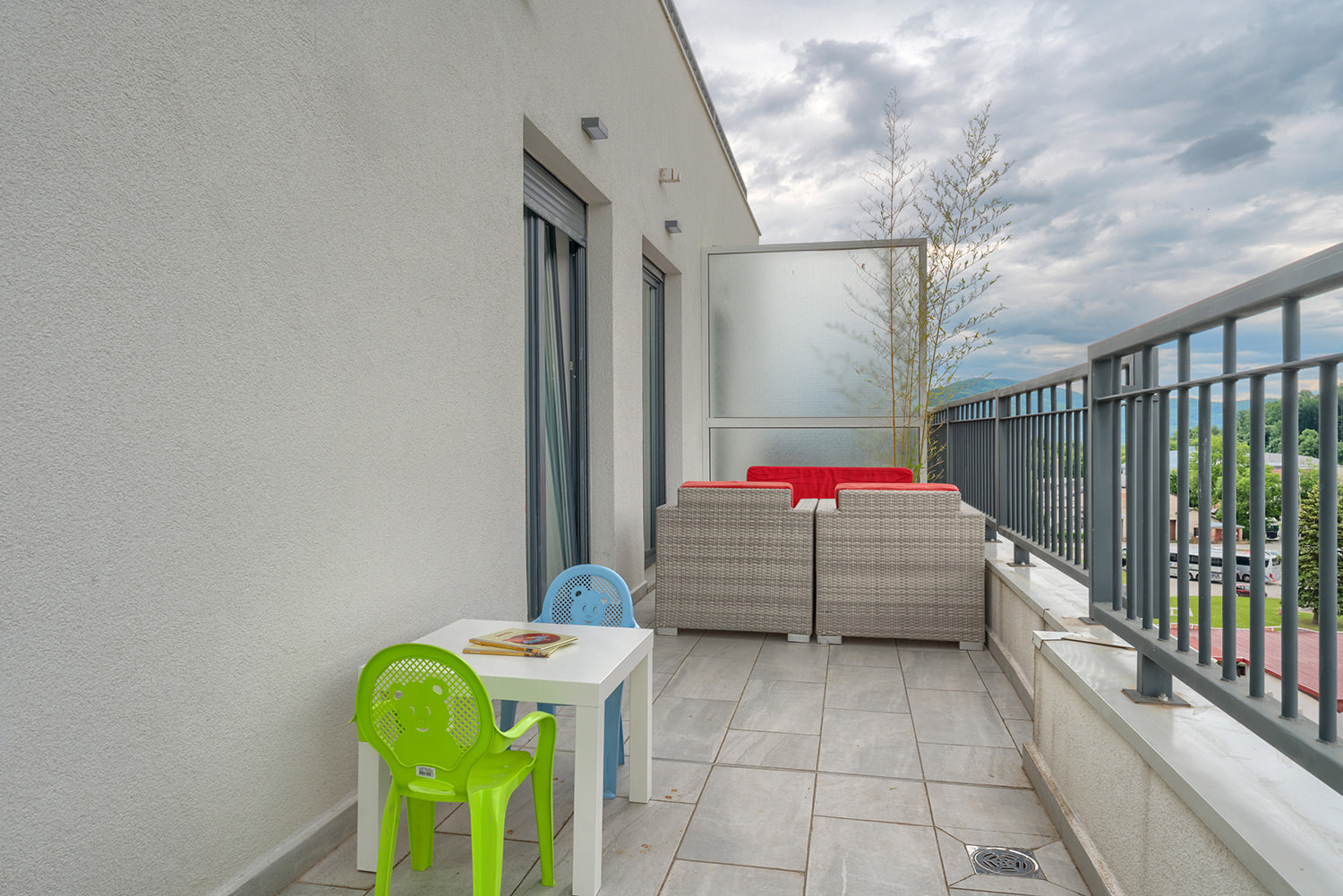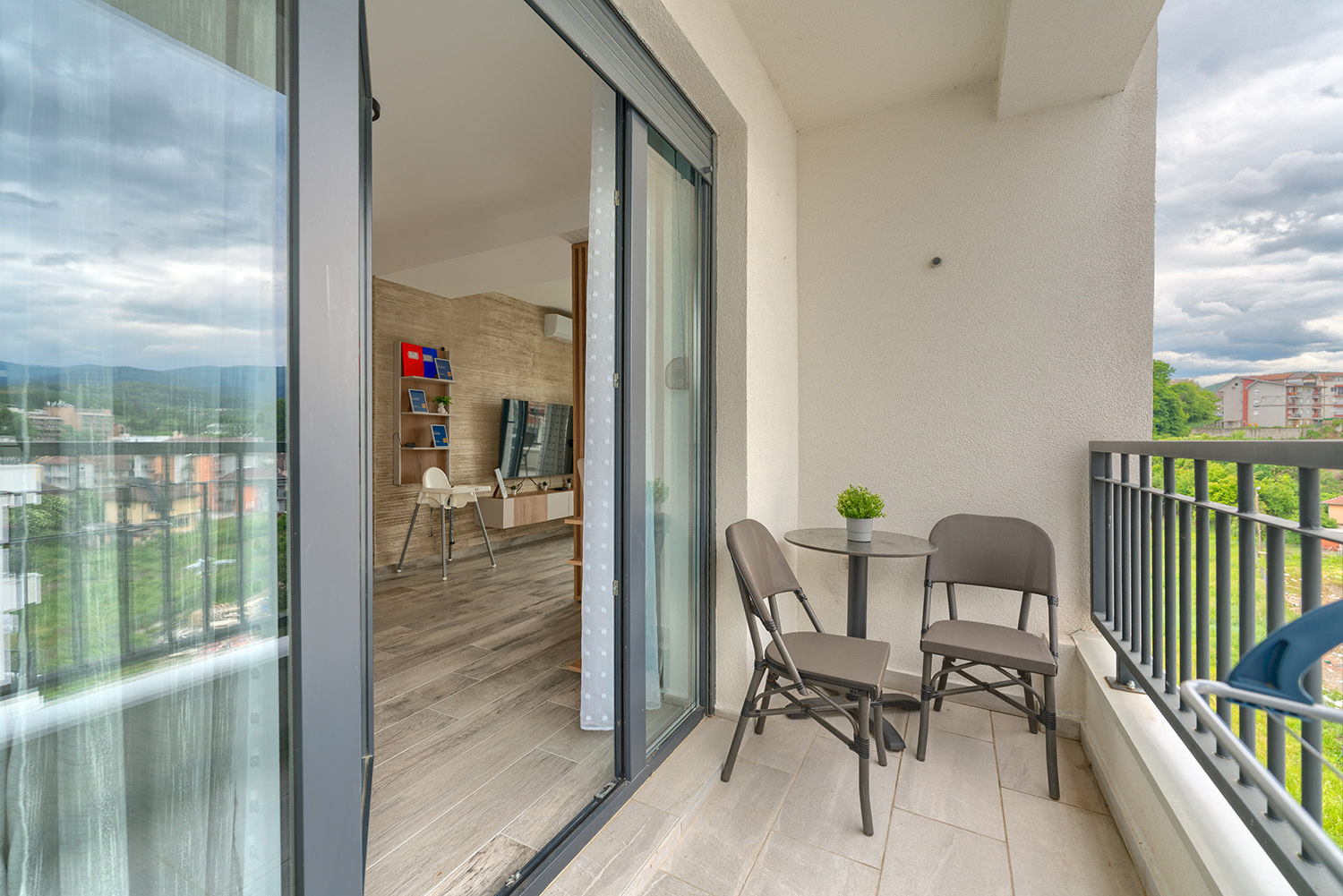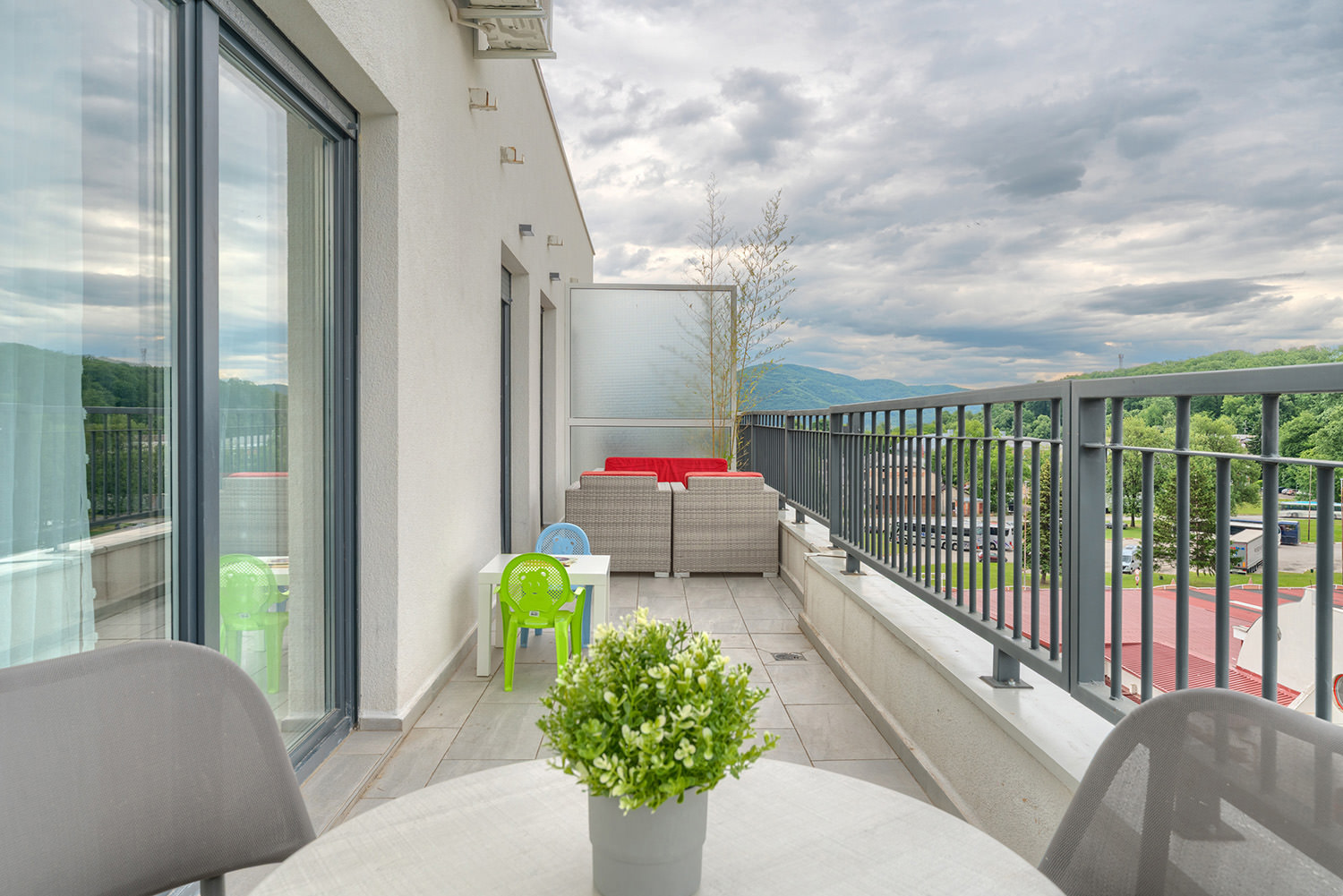 Free Wi-Fi keeps you connected to the world, while private parking ensures a safe spot for your vehicle. A comfortable double bed guarantees peaceful and quality sleep, and the children's room is a favorite spot for our youngest guests. The kitchen area with a dining table allows you to enjoy meals in the privacy of your apartment. The spacious living room is ideal for relaxing and socializing, and the TV with a wide selection of channels offers entertainment and leisure. A special advantage of our apartments is the terrace — the perfect place to enjoy fresh air and a beautiful view.