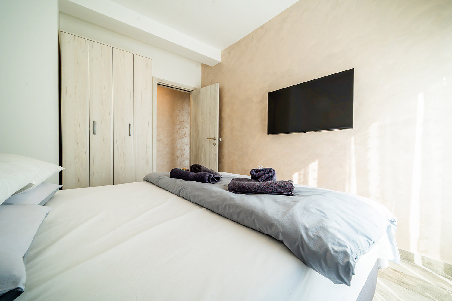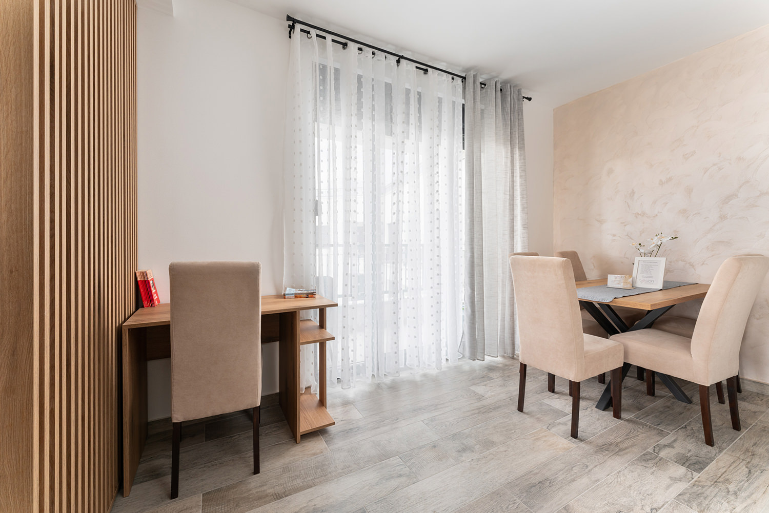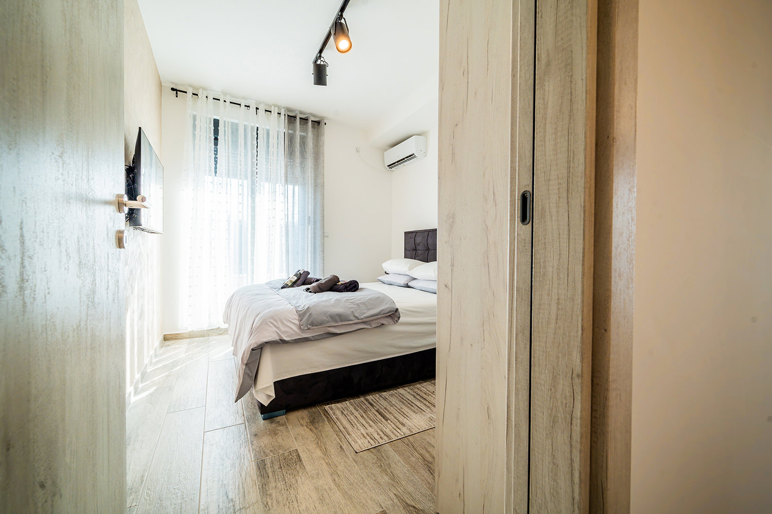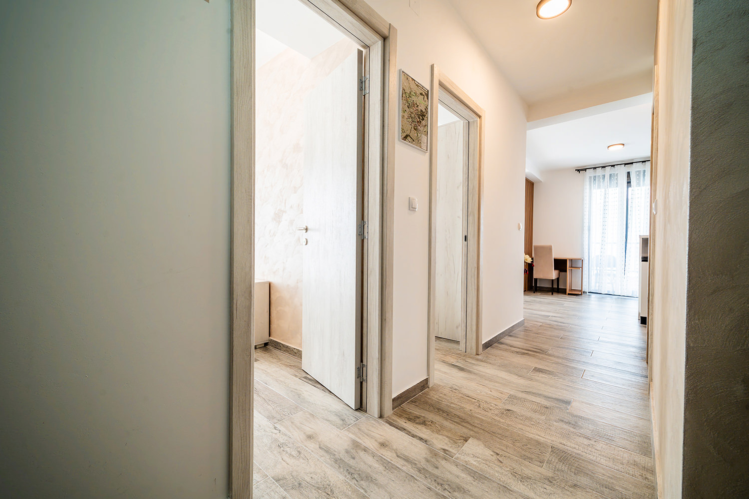 Free Wi-Fi keeps you connected to the world, while private parking ensures a safe spot for your vehicle. A comfortable double bed guarantees peaceful and quality sleep, and the children's room is a favorite spot for our youngest guests. The kitchen area with a dining table allows you to enjoy meals in the privacy of your apartment. The spacious living room is ideal for relaxing and socializing, and the TV with a wide selection of channels offers entertainment and leisure. A special advantage of our apartments is the terrace — the perfect place to enjoy fresh air and a beautiful view.
